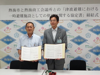 熱海市と熱海商工会議所との「津波非難における一時避難施設としての使用に関する協定書」の締結式を行いました。