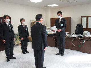 この度の議会で、監査委員として竹部隆氏を、固定資産評価審査委員会委員として4期目となる鈴木道夫氏を選任し、辞令を交付いたしました。